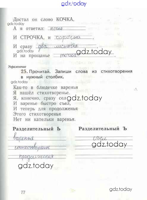 На страницах сайта gdz.today вы найдете учебный и вспомогательный материал, направленный на улучшения знаний школьной программы. ГДЗ - онлайн мир знаний Решение к тетради №2. Страницы 77 Рабочей тетради по Русскому языку для 1 класса Иванов, Евдокимова Вентана-граф Начальная школа XXI века 2016