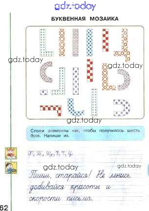 На страницах сайта gdz.today вы найдете учебный и вспомогательный материал, направленный на улучшения знаний школьной программы. ГДЗ - онлайн мир знаний Решение к части 2. Страницы 62 Прописям по Русскому языку для 1 класса Климанова, Абрамов Просвещение Перспектива 2021