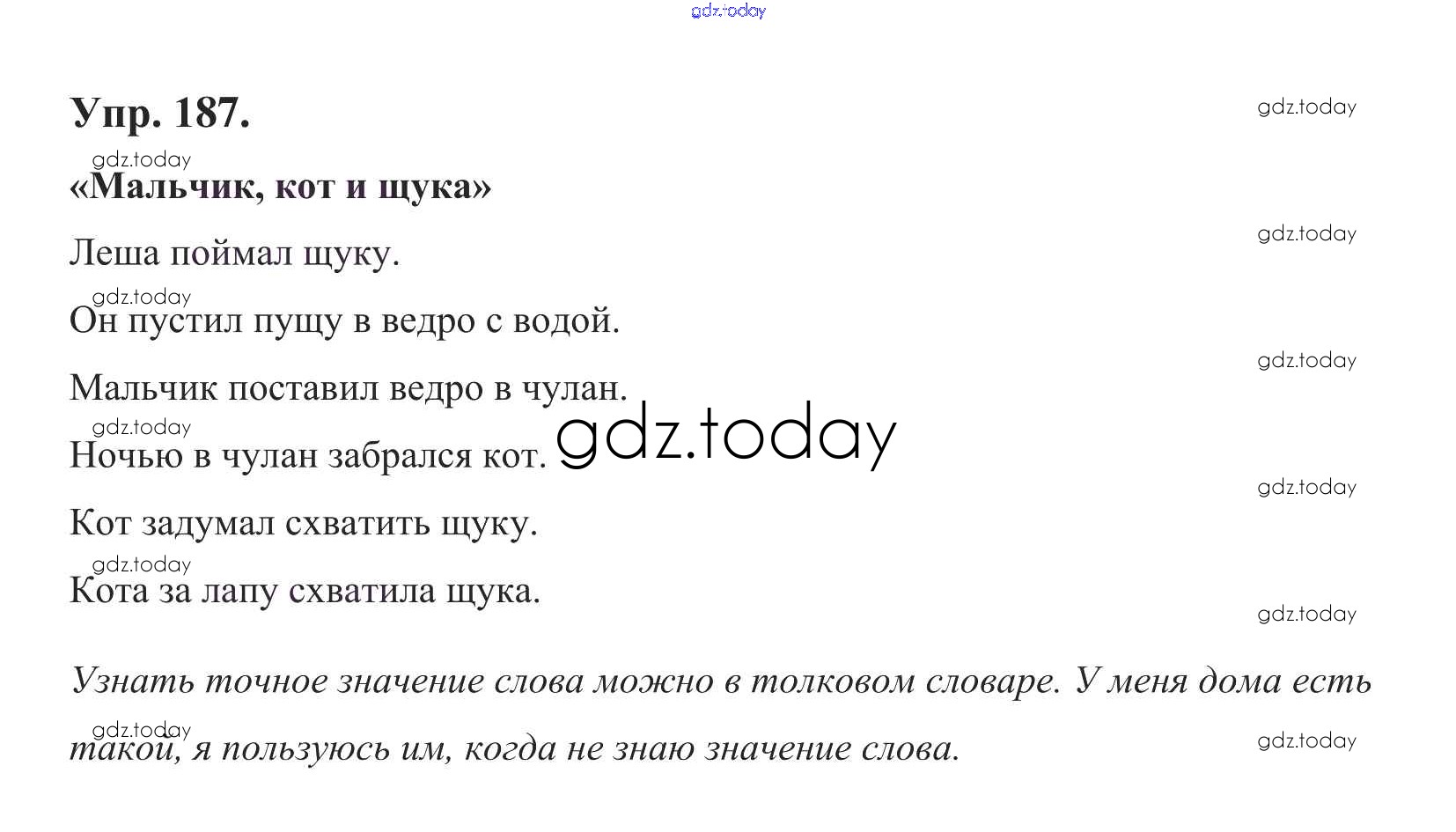На страницах сайта gdz.today вы найдете учебный и вспомогательный материал, направленный на улучшения знаний школьной программы. ГДЗ - онлайн мир знаний Решение к теме 17. Правописание буквосочетаний Упр. 187 Учебнику по Русскому языку для 1 класса Климанова, Макеева Просвещение Перспектива 2011