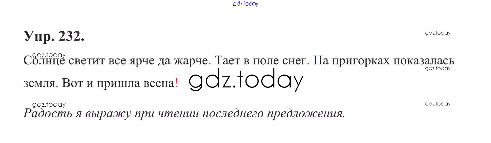 На страницах сайта gdz.today вы найдете учебный и вспомогательный материал, направленный на улучшения знаний школьной программы. ГДЗ - онлайн мир знаний Решение к теме 22. Знаки препинания Упр. 232 Учебнику по Русскому языку для 1 класса Климанова, Макеева Просвещение Перспектива 2011