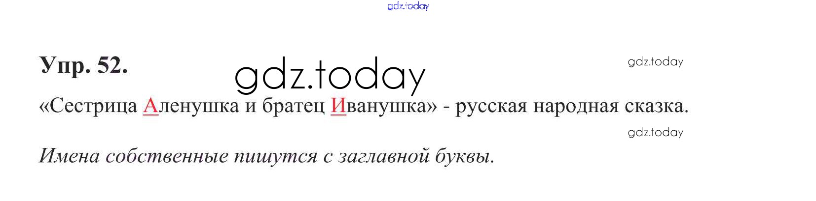 На страницах сайта gdz.today вы найдете учебный и вспомогательный материал, направленный на улучшения знаний школьной программы. ГДЗ - онлайн мир знаний Решение к теме 4. Имя собственное Упр. 52 Учебнику по Русскому языку для 1 класса Климанова, Макеева Просвещение Перспектива 2011