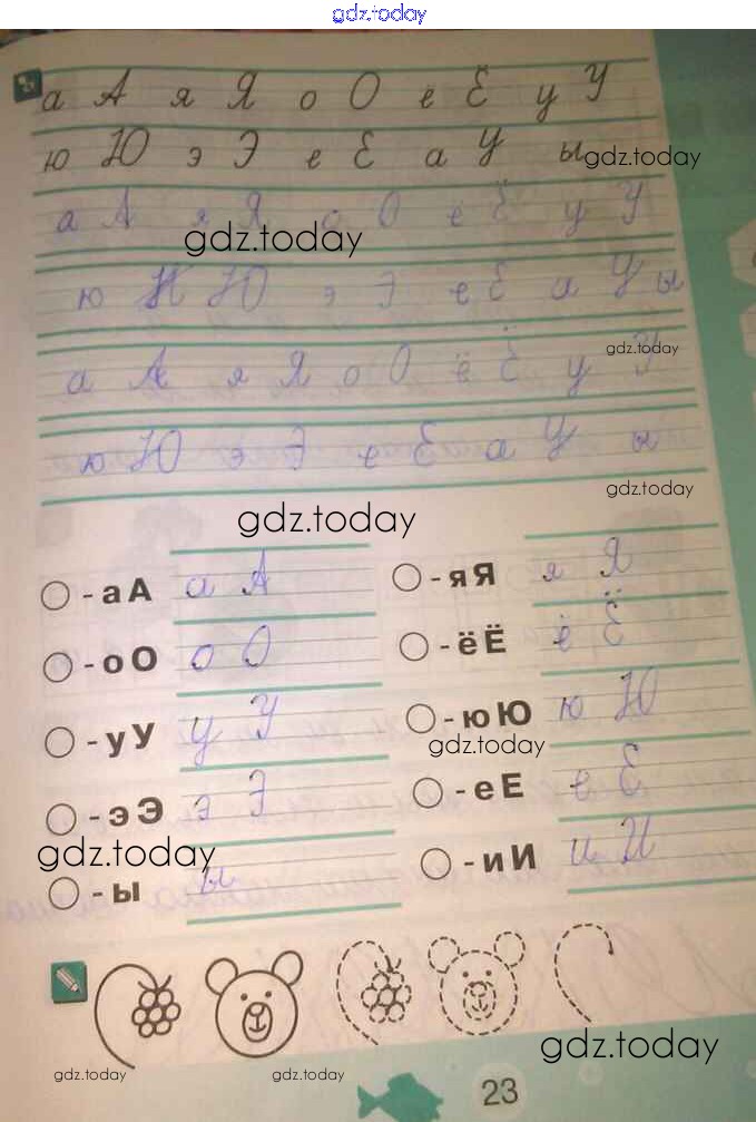 На страницах сайта gdz.today вы найдете учебный и вспомогательный материал, направленный на улучшения знаний школьной программы. ГДЗ - онлайн мир знаний Решение к тетради №2. Страницы  23 Тетради по письму по Русскому языку для 1 класса Агаркова  Вита-Пресс  2019