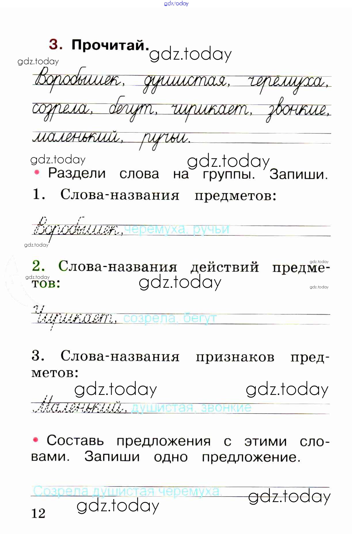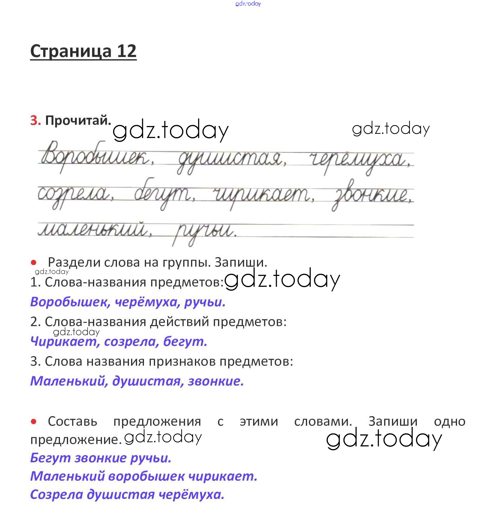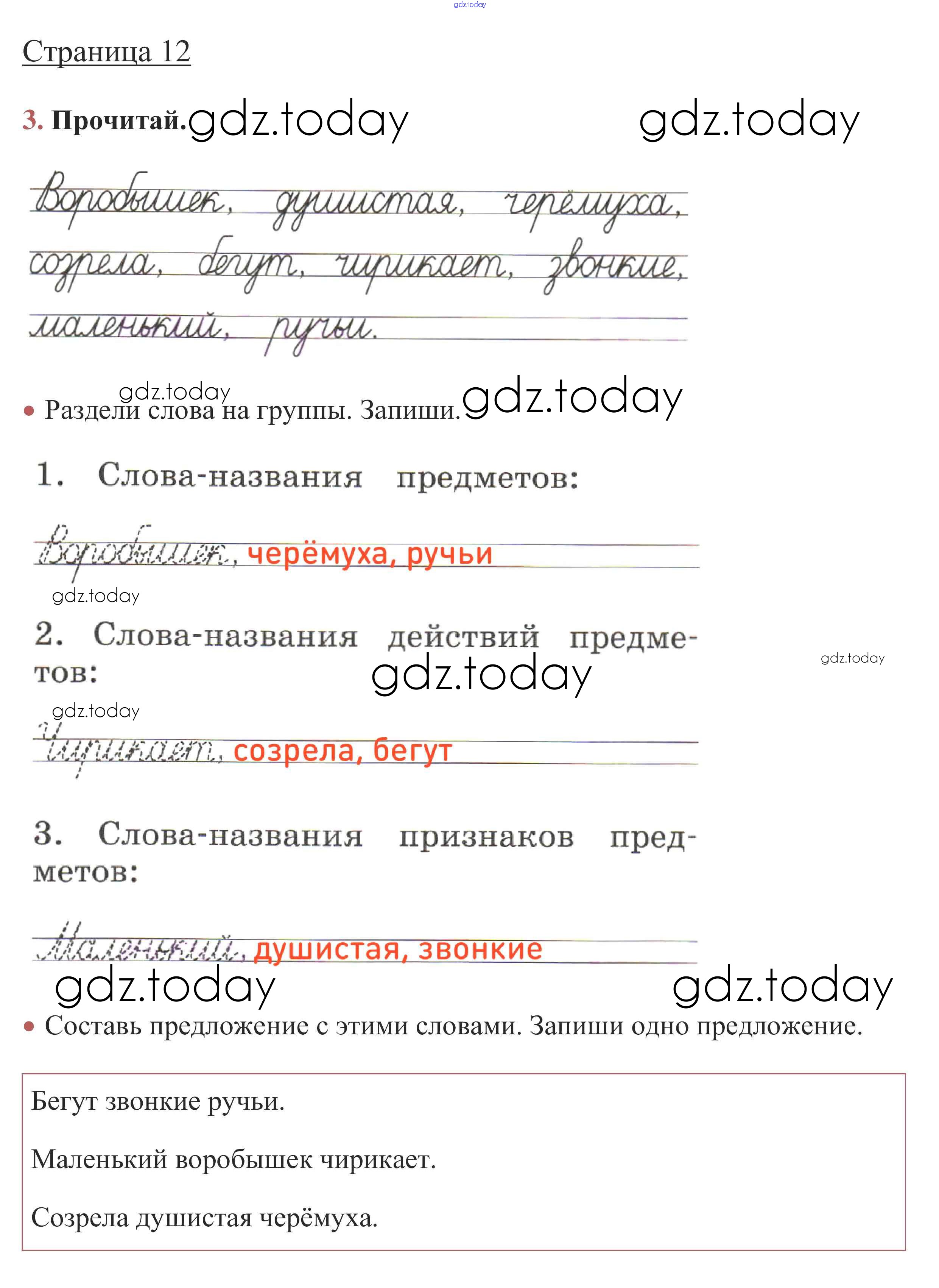 На страницах сайта gdz.today вы найдете учебный и вспомогательный материал, направленный на улучшения знаний школьной программы. ГДЗ - онлайн мир знаний Решение. Глава 3. Слова, слова, слова...  стр. 12 Рабочей тетради по Русскому языку для 1 класса Канакина, Горецкий  Просвещение Школа России 2013