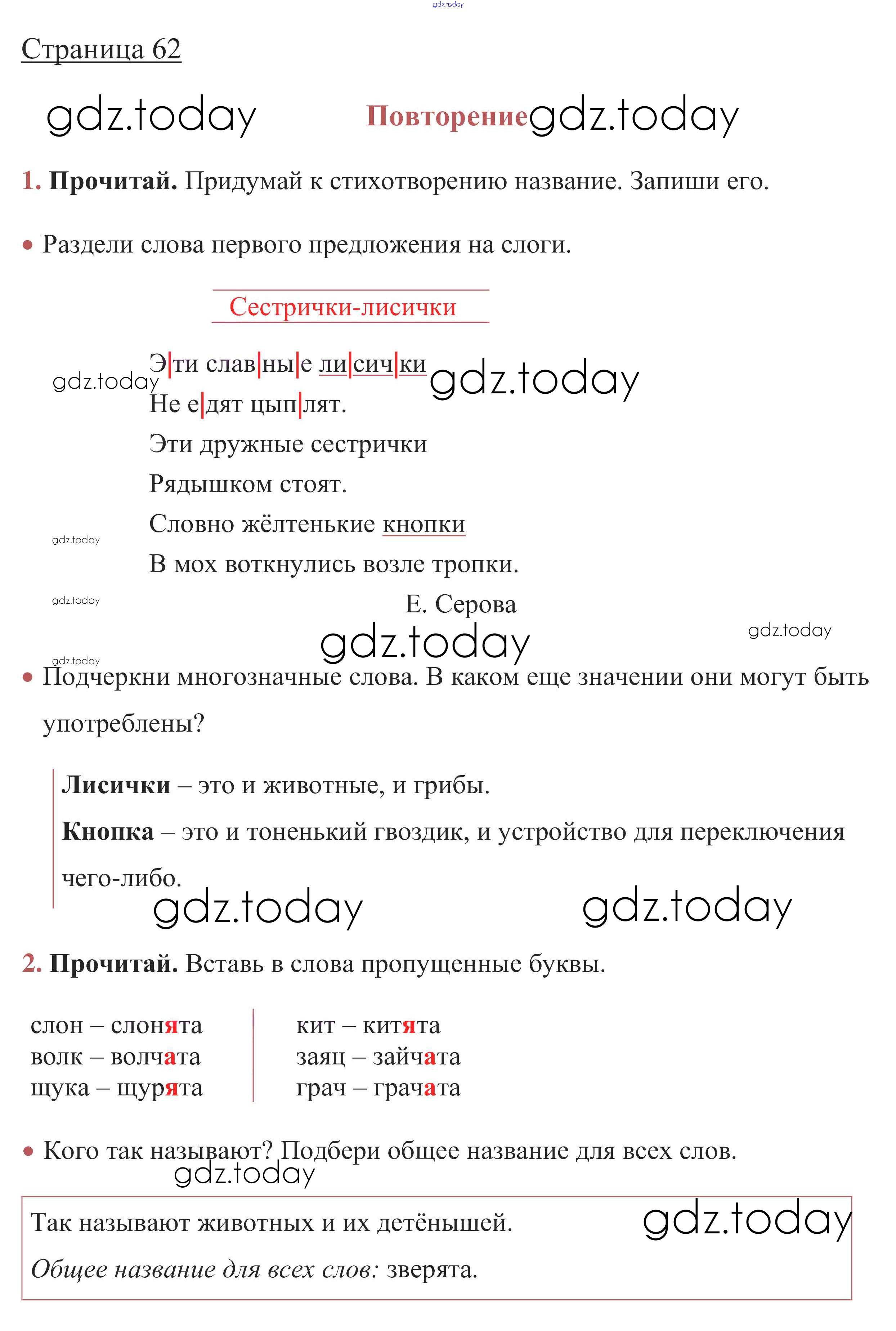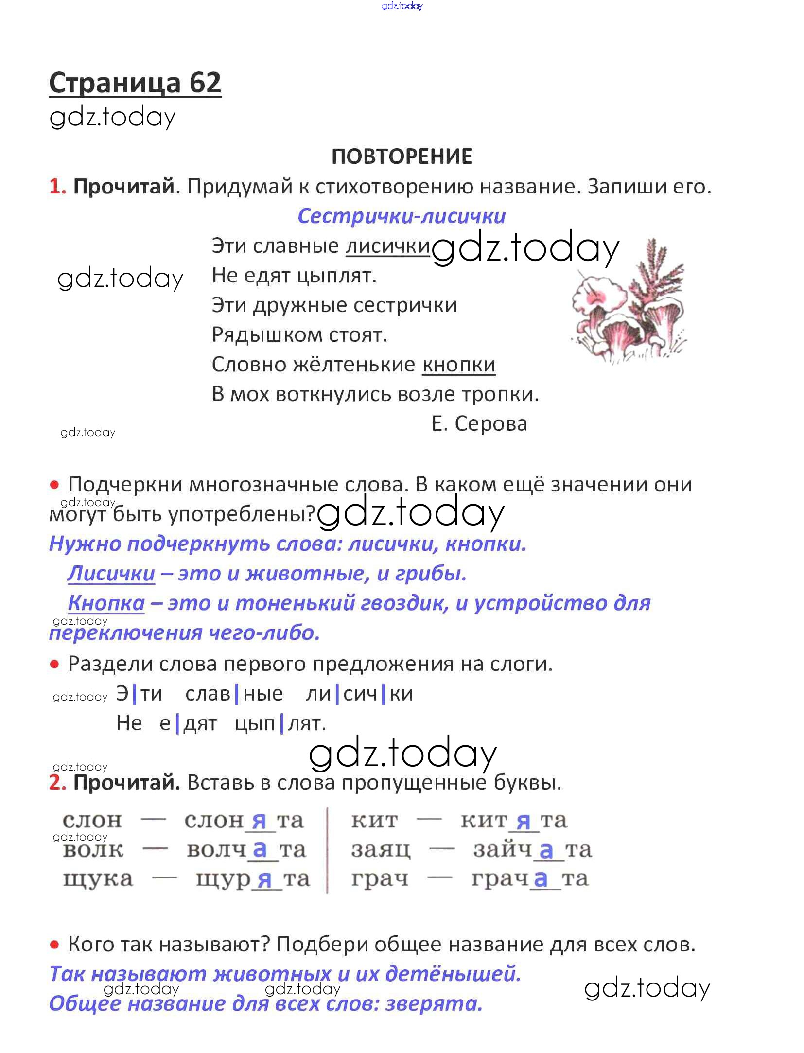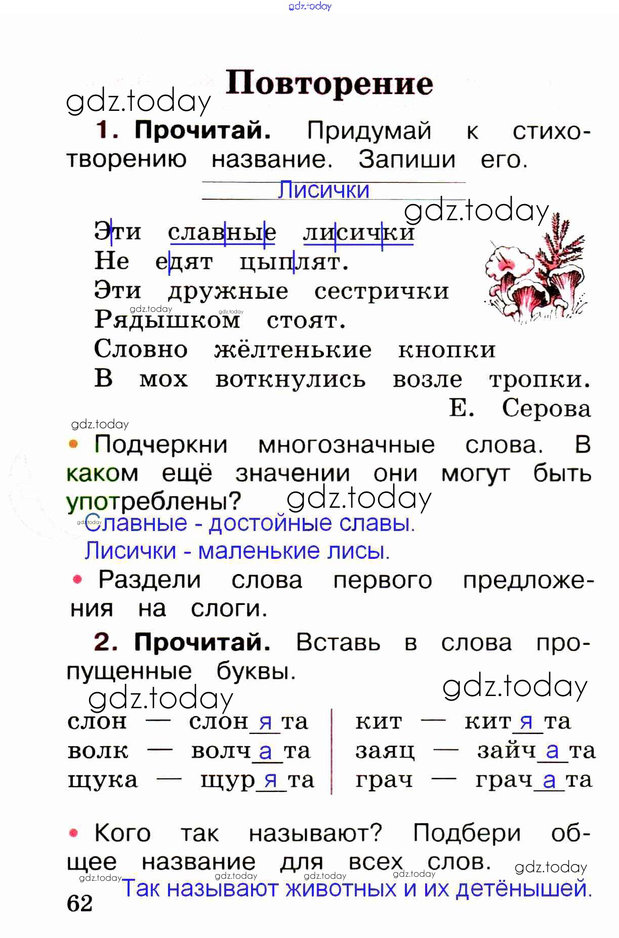 На страницах сайта gdz.today вы найдете учебный и вспомогательный материал, направленный на улучшения знаний школьной программы. ГДЗ - онлайн мир знаний Решение. Повторение  стр. 62 Рабочей тетради по Русскому языку для 1 класса Канакина, Горецкий  Просвещение Школа России 2013