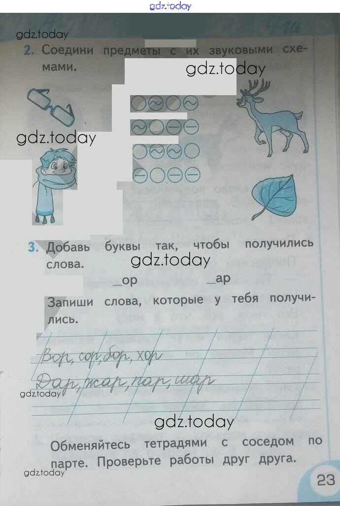 На страницах сайта gdz.today вы найдете учебный и вспомогательный материал, направленный на улучшения знаний школьной программы. ГДЗ - онлайн мир знаний Страницы (решение)  23 Рабочей тетради по Русскому языку для 1 класса Тихомирова  Экзамен УМК 2016