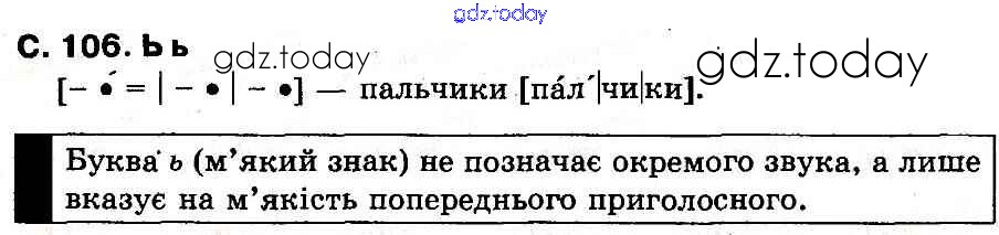 На страницах сайта gdz.today вы найдете учебный и вспомогательный материал, направленный на улучшения знаний школьной программы. ГДЗ - онлайн мир знаний Рішення до Букви (Сторінки)  106 Букварю по Украинскому языку для 1 класса Захарийчук, Науменко  Грамота  2012