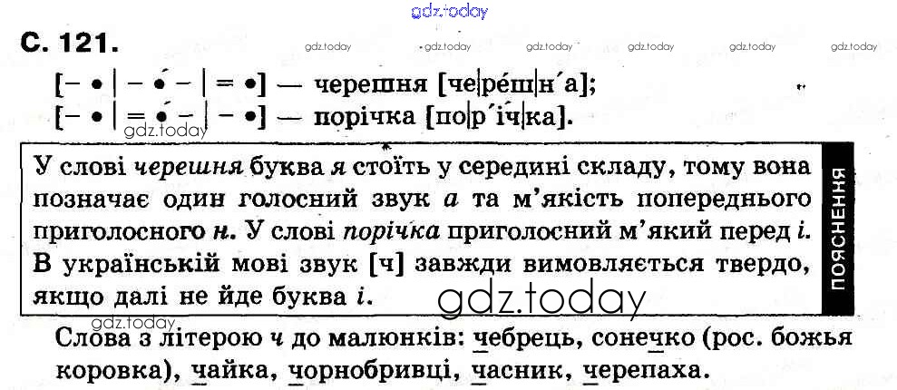 На страницах сайта gdz.today вы найдете учебный и вспомогательный материал, направленный на улучшения знаний школьной программы. ГДЗ - онлайн мир знаний Рішення до Букви (Сторінки)  121 Букварю по Украинскому языку для 1 класса Захарийчук, Науменко  Грамота  2012