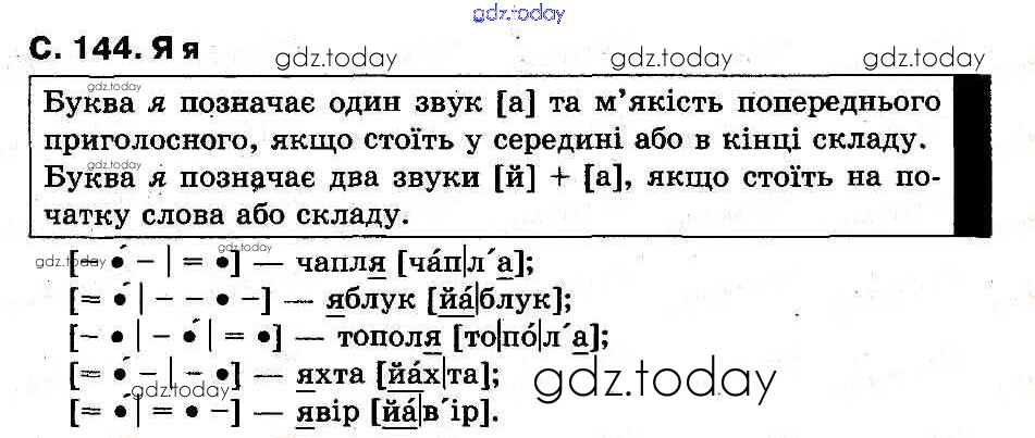 На страницах сайта gdz.today вы найдете учебный и вспомогательный материал, направленный на улучшения знаний школьной программы. ГДЗ - онлайн мир знаний Рішення до Букви (Сторінки)  144 Букварю по Украинскому языку для 1 класса Захарийчук, Науменко  Грамота  2012
