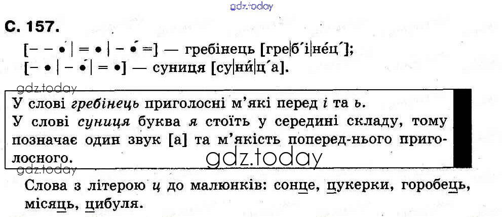 На страницах сайта gdz.today вы найдете учебный и вспомогательный материал, направленный на улучшения знаний школьной программы. ГДЗ - онлайн мир знаний Рішення до Букви (Сторінки)  157 Букварю по Украинскому языку для 1 класса Захарийчук, Науменко  Грамота  2012