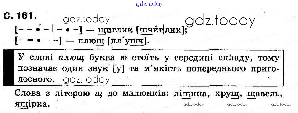 На страницах сайта gdz.today вы найдете учебный и вспомогательный материал, направленный на улучшения знаний школьной программы. ГДЗ - онлайн мир знаний Рішення до Букви (Сторінки)  161 Букварю по Украинскому языку для 1 класса Захарийчук, Науменко  Грамота  2012