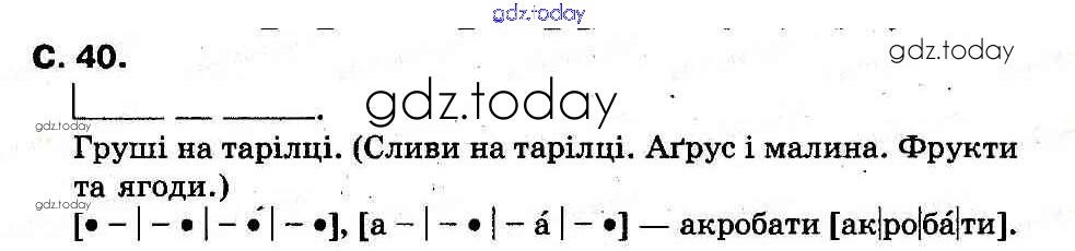 На страницах сайта gdz.today вы найдете учебный и вспомогательный материал, направленный на улучшения знаний школьной программы. ГДЗ - онлайн мир знаний Рішення до Букви (Сторінки)  40 Букварю по Украинскому языку для 1 класса Захарийчук, Науменко  Грамота  2012