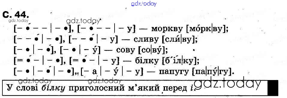 На страницах сайта gdz.today вы найдете учебный и вспомогательный материал, направленный на улучшения знаний школьной программы. ГДЗ - онлайн мир знаний Рішення до Букви (Сторінки)  44 Букварю по Украинскому языку для 1 класса Захарийчук, Науменко  Грамота  2012