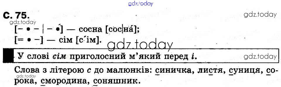 На страницах сайта gdz.today вы найдете учебный и вспомогательный материал, направленный на улучшения знаний школьной программы. ГДЗ - онлайн мир знаний Рішення до Букви (Сторінки)  75 Букварю по Украинскому языку для 1 класса Захарийчук, Науменко  Грамота  2012