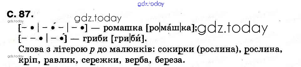 На страницах сайта gdz.today вы найдете учебный и вспомогательный материал, направленный на улучшения знаний школьной программы. ГДЗ - онлайн мир знаний Рішення до Букви (Сторінки)  87 Букварю по Украинскому языку для 1 класса Захарийчук, Науменко  Грамота  2012