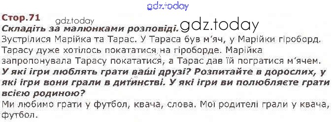 На страницах сайта gdz.today вы найдете учебный и вспомогательный материал, направленный на улучшения знаний школьной программы. ГДЗ - онлайн мир знаний Рішення до частини 1 71 Учебнику по я исследую мир для 1 класса Гильберг Генеза 2018