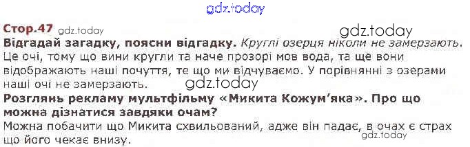 На страницах сайта gdz.today вы найдете учебный и вспомогательный материал, направленный на улучшения знаний школьной программы. ГДЗ - онлайн мир знаний Рішення до частини 1 47 Учебнику по я исследую мир для 1 класса Грущинская Орiон 2018