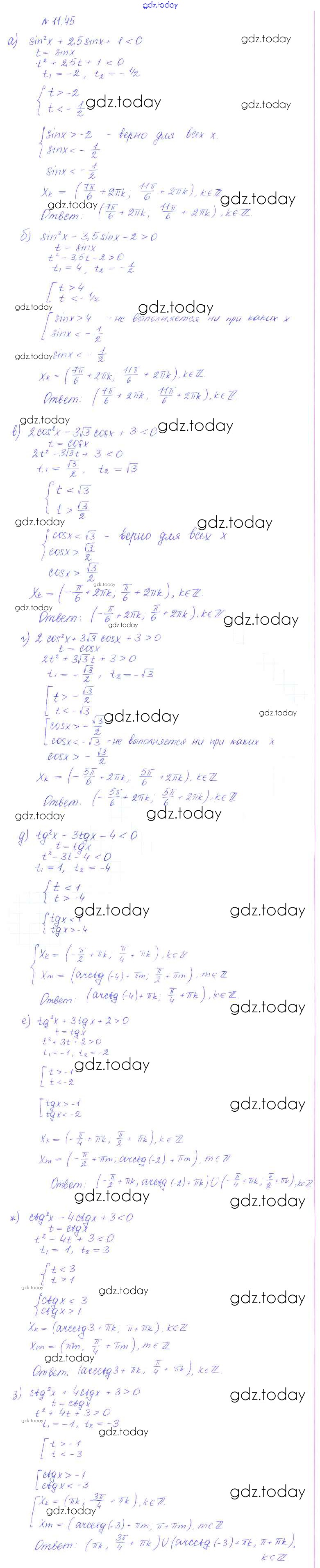 На страницах сайта gdz.today вы найдете учебный и вспомогательный материал, направленный на улучшения знаний школьной программы. ГДЗ - онлайн мир знаний §11. Тригонометрические уравнения и неравенства Решение к главе 2. Тригонометрические формулы. Тригонометрические функции 45 Учебнику по Алгебре для 10 класса Никольский, Потапов Базовый и углубленный уровень Просвещение МГУ - школе 2015