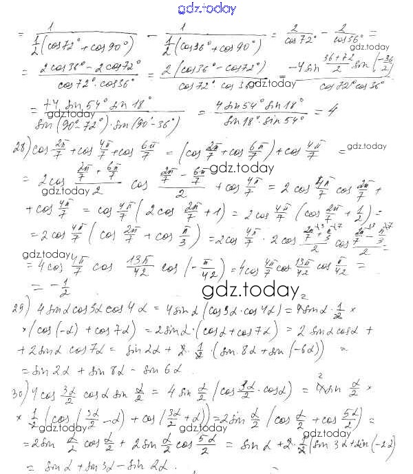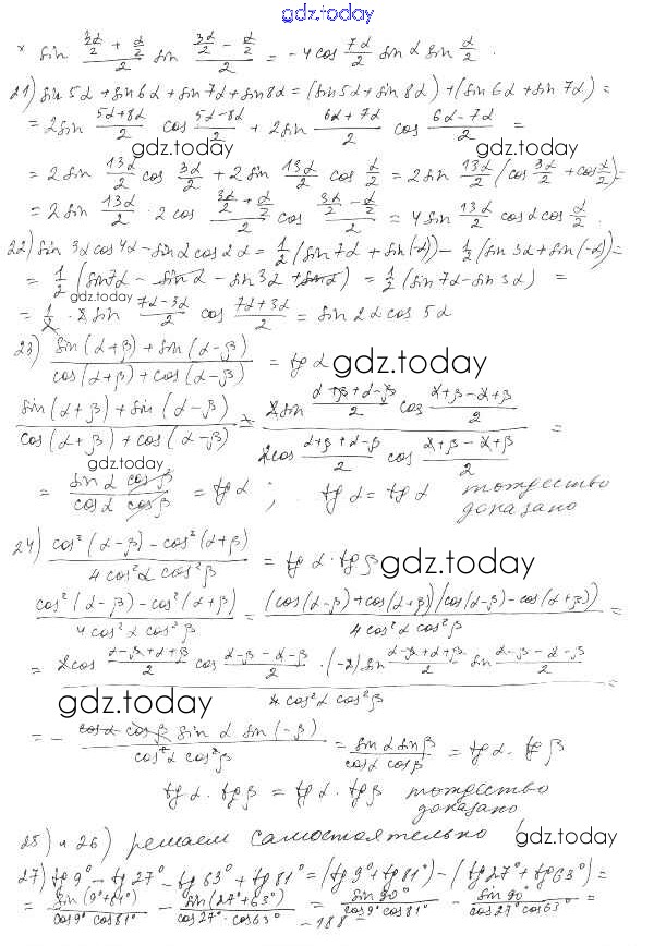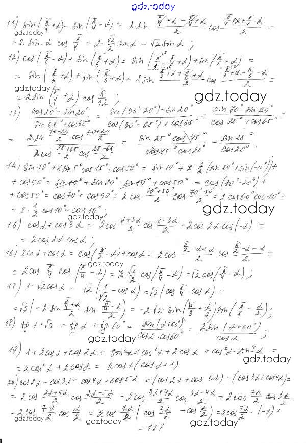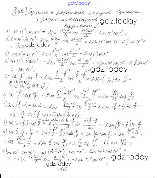 На страницах сайта gdz.today вы найдете учебный и вспомогательный материал, направленный на улучшения знаний школьной программы. ГДЗ - онлайн мир знаний §32. Сумма и разность синусов. Сумма и разность косинусов Решение к главе 5. Тригонометрические формулы вариант 1 Дидактическим материалам по Алгебре для 10 класса Шабунин, Ткачева Базовый и углубленный уровень Просвещение 2017