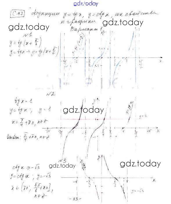 На страницах сайта gdz.today вы найдете учебный и вспомогательный материал, направленный на улучшения знаний школьной программы. ГДЗ - онлайн мир знаний СР-17. Функции y=tg, x y=ctg x, их свойства и графики Решение к главе 2. Тригонометрические функции вариант 1 Самостоятельным работам по Алгебре для 10 класса Александрова Базовый уровень Мнемозина 2017