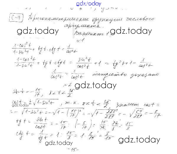 Ответы к СР-9. Тригонометрические функции числового аргумента Решение к главе 2. Тригонометрические функции вариант 1 Самостоятельным работам по Алгебре для 10 класса Александрова Базовый уровень Мнемозина 2017