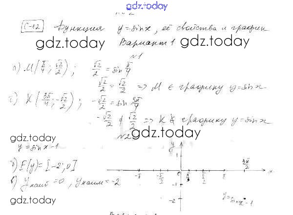 На страницах сайта gdz.today вы найдете учебный и вспомогательный материал, направленный на улучшения знаний школьной программы. ГДЗ - онлайн мир знаний СР-12. Функция y=sin. x и ее график Решение к главе 2. Тригонометрические функции вариант 1 Самостоятельным работам по Алгебре для 10 класса Александрова Базовый уровень Мнемозина 2017