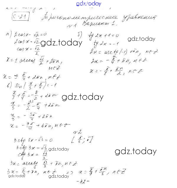 На страницах сайта gdz.today вы найдете учебный и вспомогательный материал, направленный на улучшения знаний школьной программы. ГДЗ - онлайн мир знаний СР-21. Тригонометрические уравнения Решение к главе 3. Тригонометрические уравнения вариант 1 Самостоятельным работам по Алгебре для 10 класса Александрова Базовый уровень Мнемозина 2017
