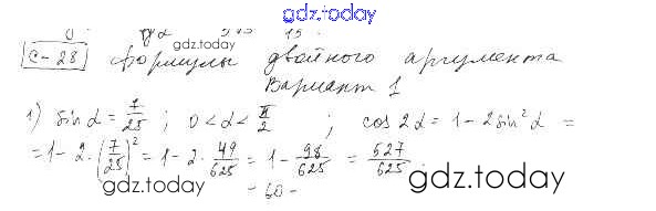 На страницах сайта gdz.today вы найдете учебный и вспомогательный материал, направленный на улучшения знаний школьной программы. ГДЗ - онлайн мир знаний СР-28. Формулы двойного аргумента Решение к главе 4. Преобразование тригонометрических выражений вариант 1 Самостоятельным работам по Алгебре для 10 класса Александрова Базовый уровень Мнемозина 2017