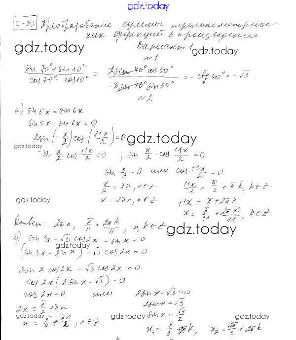 На страницах сайта gdz.today вы найдете учебный и вспомогательный материал, направленный на улучшения знаний школьной программы. ГДЗ - онлайн мир знаний СР-30. Преобразование суммы тригонометрических функций в произведении Решение к главе 4. Преобразование тригонометрических выражений вариант 1 Самостоятельным работам по Алгебре для 10 класса Александрова Базовый уровень Мнемозина 2017