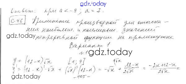 На страницах сайта gdz.today вы найдете учебный и вспомогательный материал, направленный на улучшения знаний школьной программы. ГДЗ - онлайн мир знаний СР-46. Применение производной для отыскивания наибольшего и наименьшего значений непрерывной функции на промежутке Решение к главе 5. Производная вариант 1 Самостоятельным работам по Алгебре для 10 класса Александрова Базовый уровень Мнемозина 2017