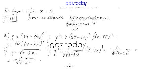 Ответы к СР-40. Вычисление производных Решение к главе 5. Производная вариант 1 Самостоятельным работам по Алгебре для 10 класса Александрова Базовый уровень Мнемозина 2017