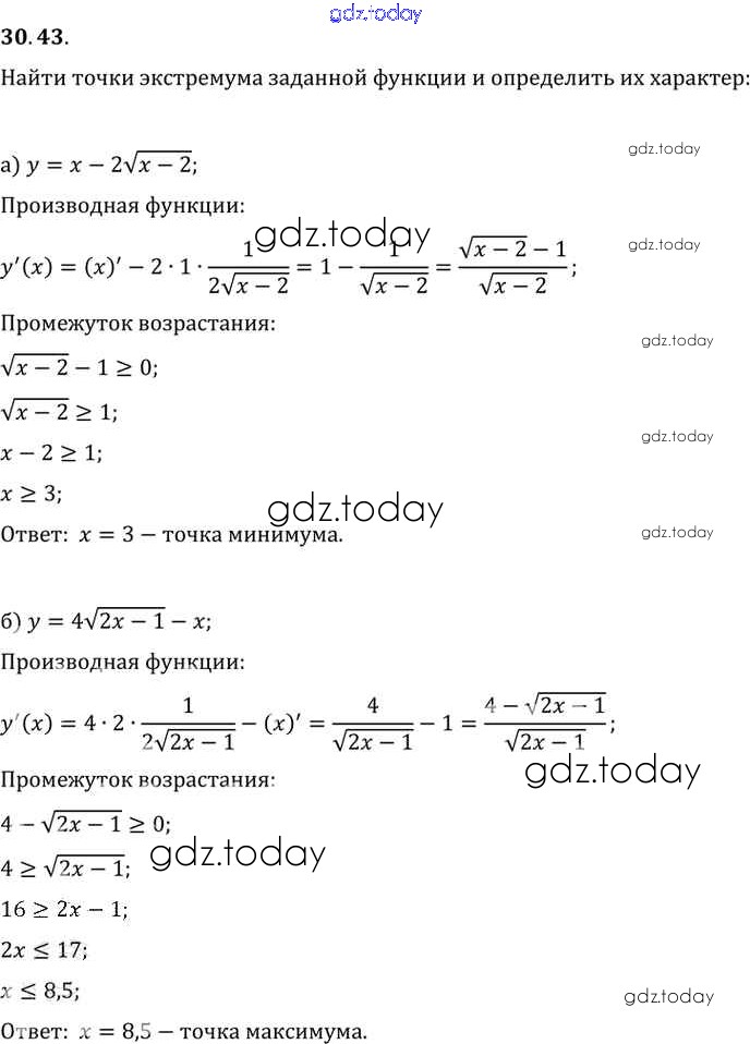 Ответы к §30. Применение производной для исследования функций на монотонность и экстремумы Глава 5 30.43 Задачнику по Алгебре для 10-11 класса Мордкович, Денищева Базовый уровень Мнемозина 2015