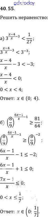 На страницах сайта gdz.today вы найдете учебный и вспомогательный материал, направленный на улучшения знаний школьной программы. ГДЗ - онлайн мир знаний §40. Показательные уравнения и неравенства Глава 7 40. 55 Задачнику по Алгебре для 10-11 класса Мордкович, Денищева Базовый уровень Мнемозина 2015