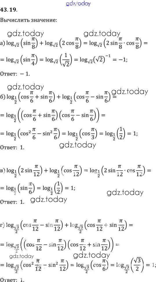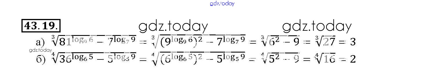 На страницах сайта gdz.today вы найдете учебный и вспомогательный материал, направленный на улучшения знаний школьной программы. ГДЗ - онлайн мир знаний §43. Свойства логарифмов Глава 7 43. 19 Задачнику по Алгебре для 10-11 класса Мордкович, Денищева Базовый уровень Мнемозина 2015