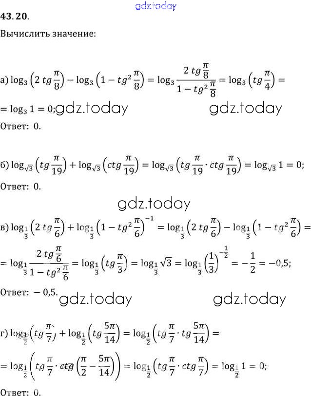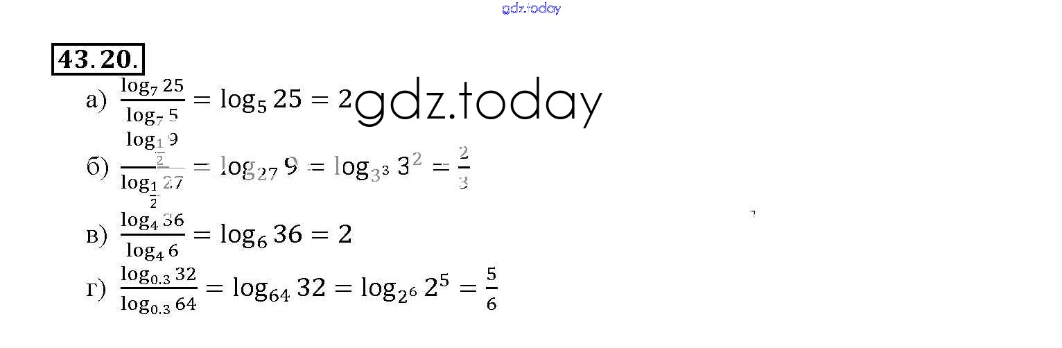 На страницах сайта gdz.today вы найдете учебный и вспомогательный материал, направленный на улучшения знаний школьной программы. ГДЗ - онлайн мир знаний §43. Свойства логарифмов Глава 7 43. 20 Задачнику по Алгебре для 10-11 класса Мордкович, Денищева Базовый уровень Мнемозина 2015
