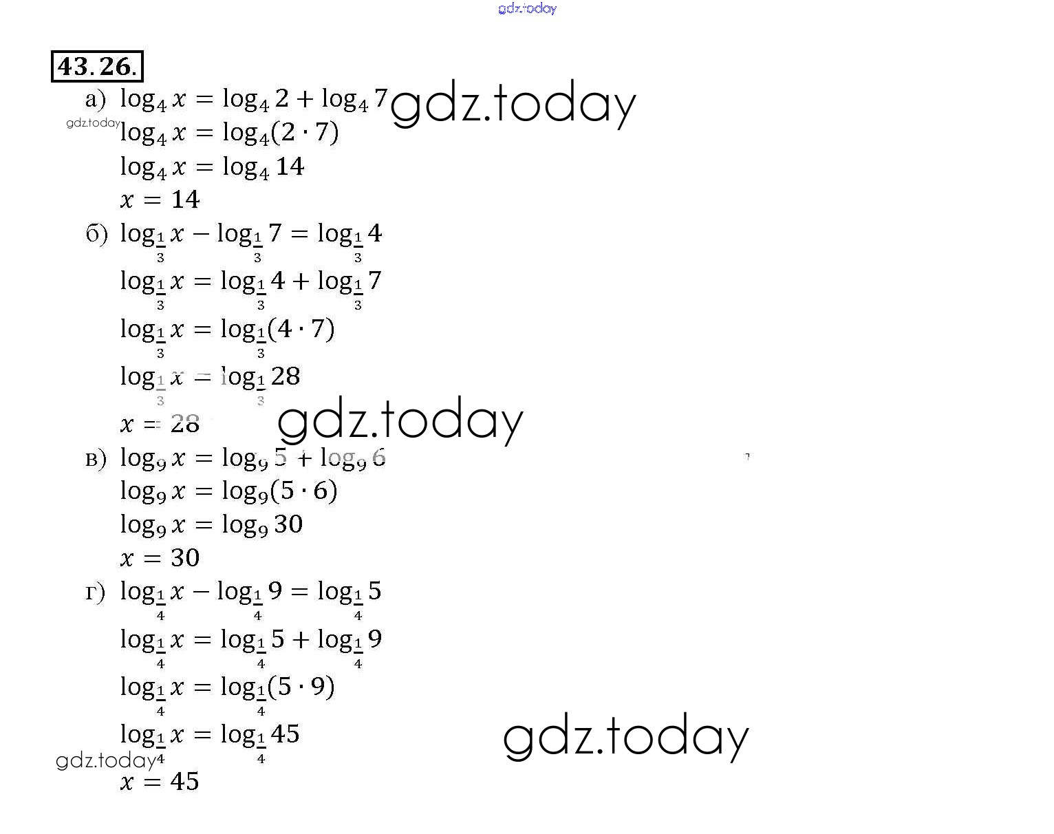 На страницах сайта gdz.today вы найдете учебный и вспомогательный материал, направленный на улучшения знаний школьной программы. ГДЗ - онлайн мир знаний §43. Свойства логарифмов Глава 7 43. 26 Задачнику по Алгебре для 10-11 класса Мордкович, Денищева Базовый уровень Мнемозина 2015