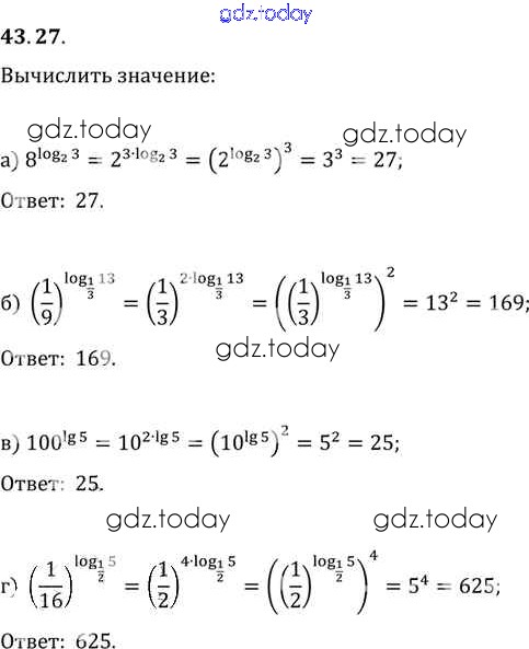 Ответы к §43. Свойства логарифмов Глава 7 43. 27 Задачнику по Алгебре для 10-11 класса Мордкович, Денищева Базовый уровень Мнемозина 2015