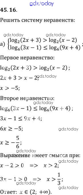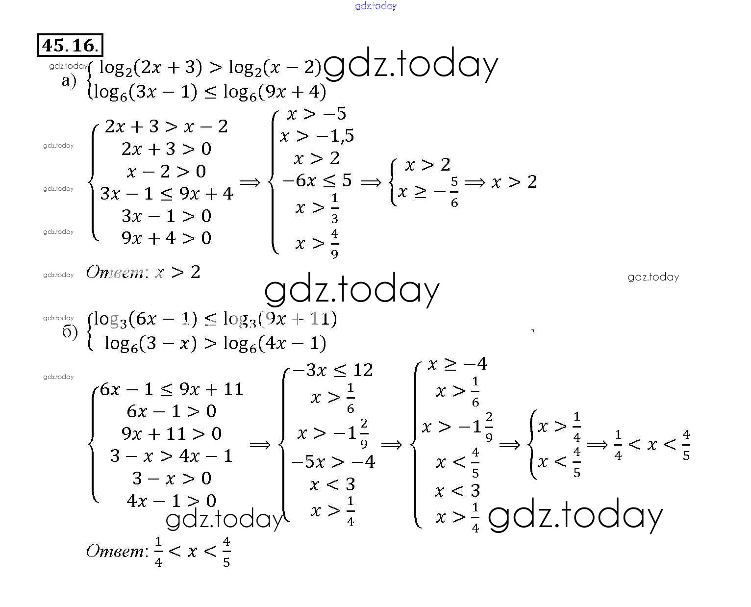 На страницах сайта gdz.today вы найдете учебный и вспомогательный материал, направленный на улучшения знаний школьной программы. ГДЗ - онлайн мир знаний §45. Логарифмические неравенства Глава 7 45. 16 Задачнику по Алгебре для 10-11 класса Мордкович, Денищева Базовый уровень Мнемозина 2015