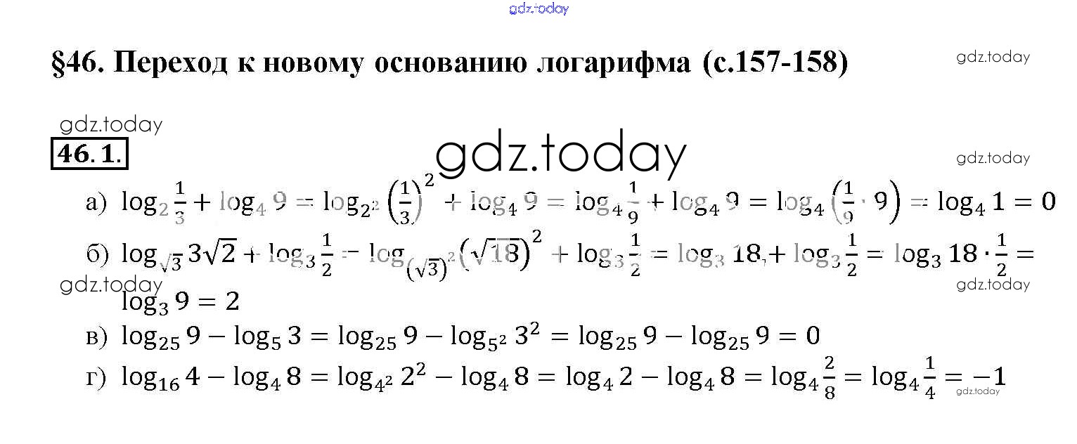 На страницах сайта gdz.today вы найдете учебный и вспомогательный материал, направленный на улучшения знаний школьной программы. ГДЗ - онлайн мир знаний §46. Переход к новому основанию логарифма Глава 7 46. 1 Задачнику по Алгебре для 10-11 класса Мордкович, Денищева Базовый уровень Мнемозина 2015