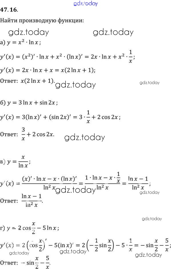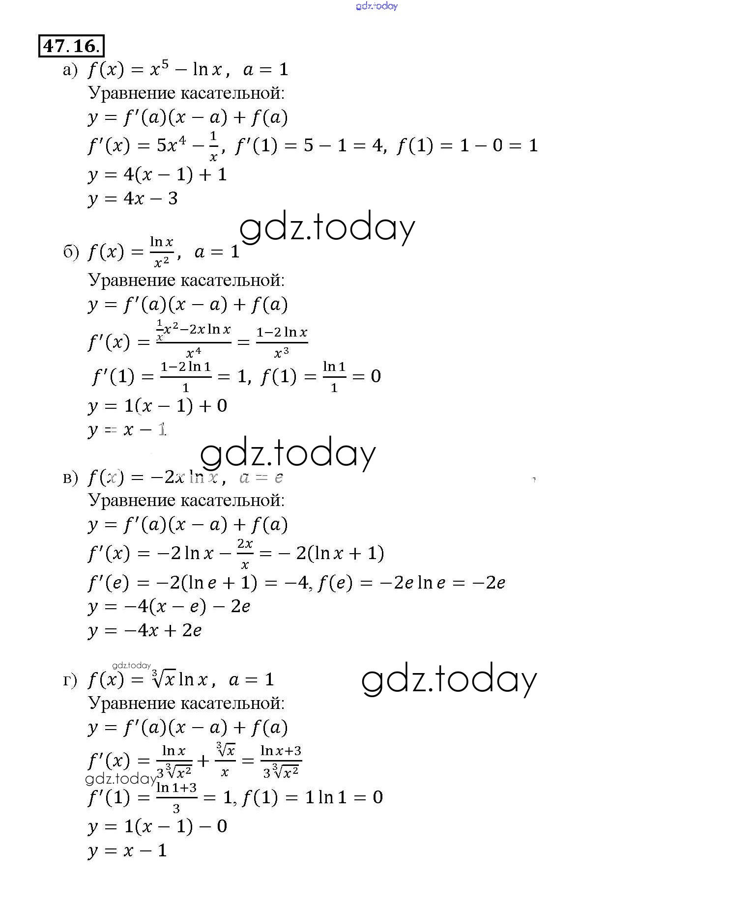 На страницах сайта gdz.today вы найдете учебный и вспомогательный материал, направленный на улучшения знаний школьной программы. ГДЗ - онлайн мир знаний §47. Дифференцирование показательной и логарифмической функций Глава 7 47. 16 Задачнику по Алгебре для 10-11 класса Мордкович, Денищева Базовый уровень Мнемозина 2015
