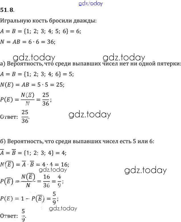 Ответы к §51. Простейшие вероятностные задачи Глава 9 51. 8 Задачнику по Алгебре для 10-11 класса Мордкович, Денищева Базовый уровень Мнемозина 2015