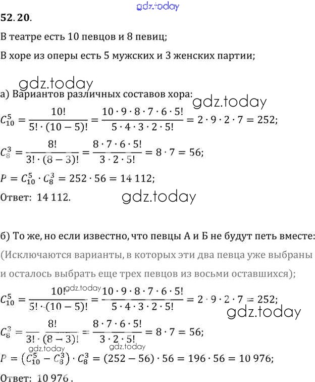Ответы к §52. Сочетания и размещения Глава 9 52. 20 Задачнику по Алгебре для 10-11 класса Мордкович, Денищева Базовый уровень Мнемозина 2015