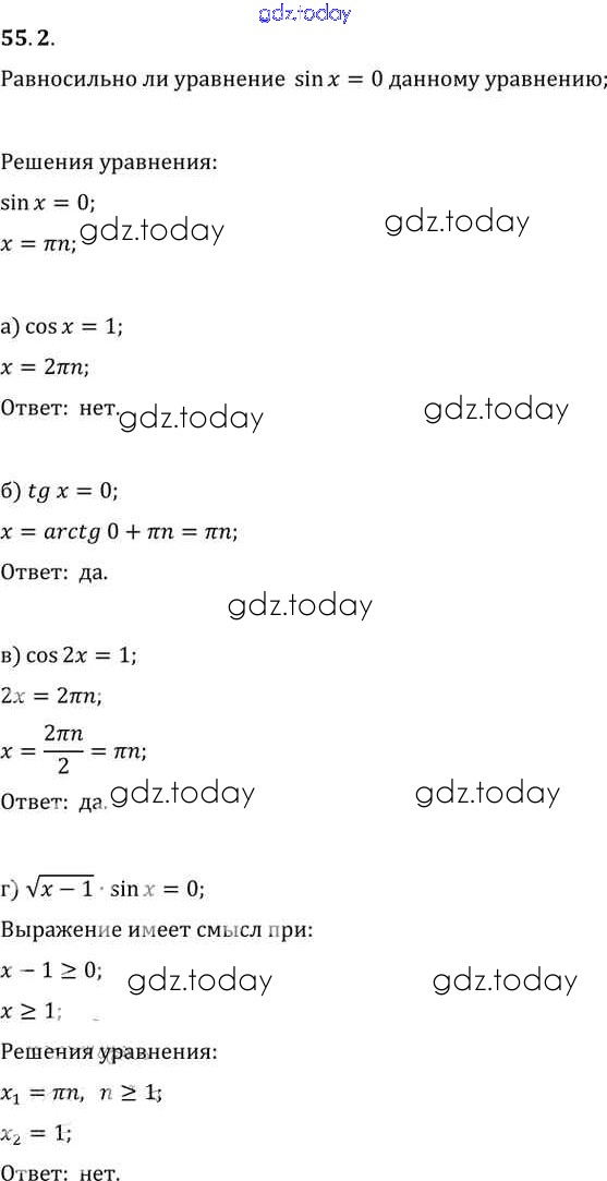 На страницах сайта gdz.today вы найдете учебный и вспомогательный материал, направленный на улучшения знаний школьной программы. ГДЗ - онлайн мир знаний §55. Равносильность уравнений Глава 10 55. 2 Задачнику по Алгебре для 10-11 класса Мордкович, Денищева Базовый уровень Мнемозина 2015
