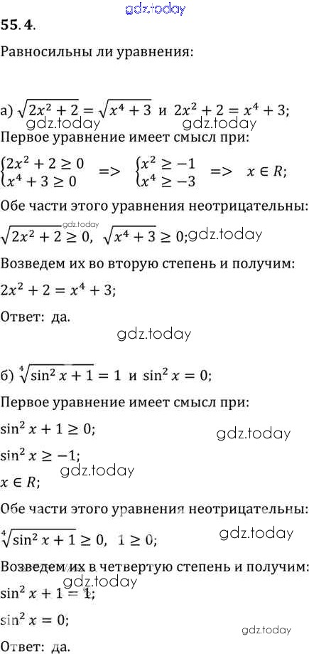 Ответы к §55. Равносильность уравнений Глава 10 55. 4 Задачнику по Алгебре для 10-11 класса Мордкович, Денищева Базовый уровень Мнемозина 2015