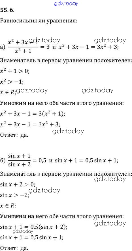 Ответы к §55. Равносильность уравнений Глава 10 55. 6 Задачнику по Алгебре для 10-11 класса Мордкович, Денищева Базовый уровень Мнемозина 2015