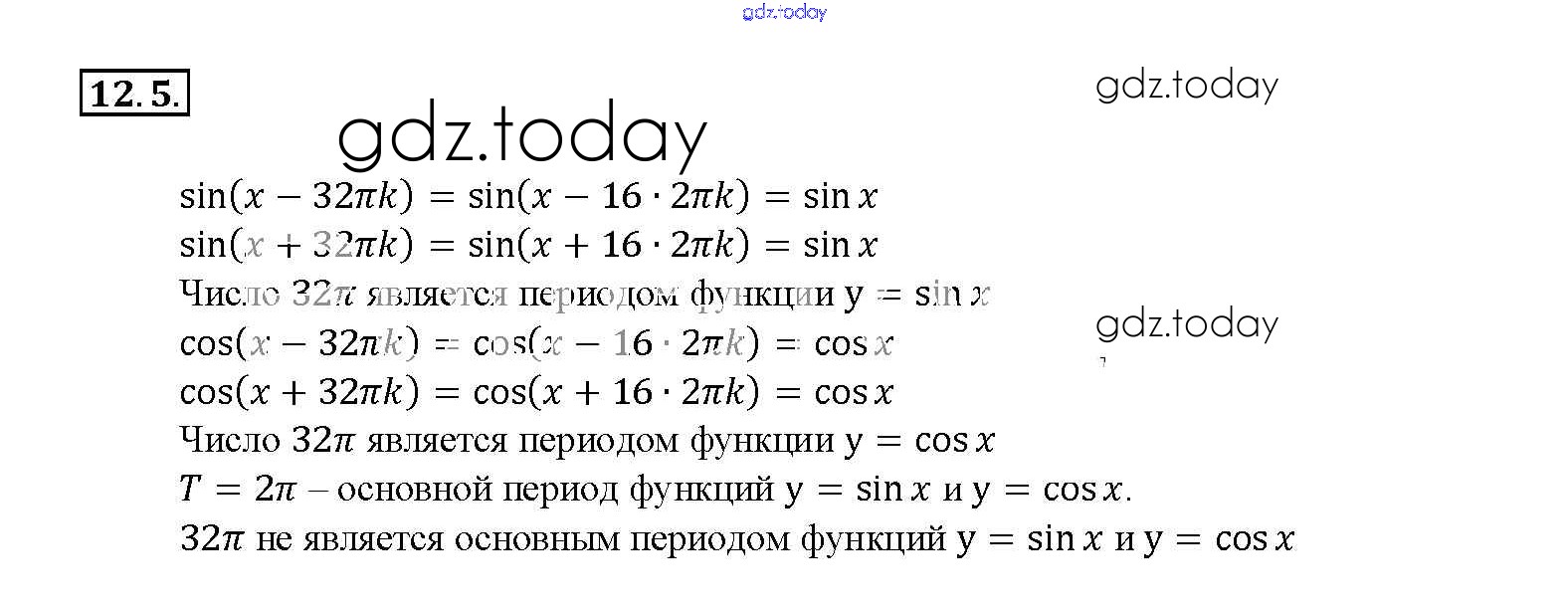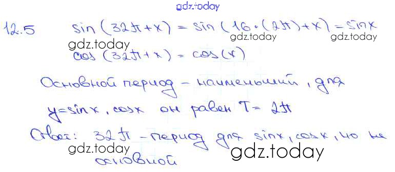 На страницах сайта gdz.today вы найдете учебный и вспомогательный материал, направленный на улучшения знаний школьной программы. ГДЗ - онлайн мир знаний §12. Периодичность функций y = sin x, y = cos x Глава 2 12. 5 Задачнику по Алгебре для 10-11 класса Мордкович, Денищева Базовый уровень Мнемозина 2015
