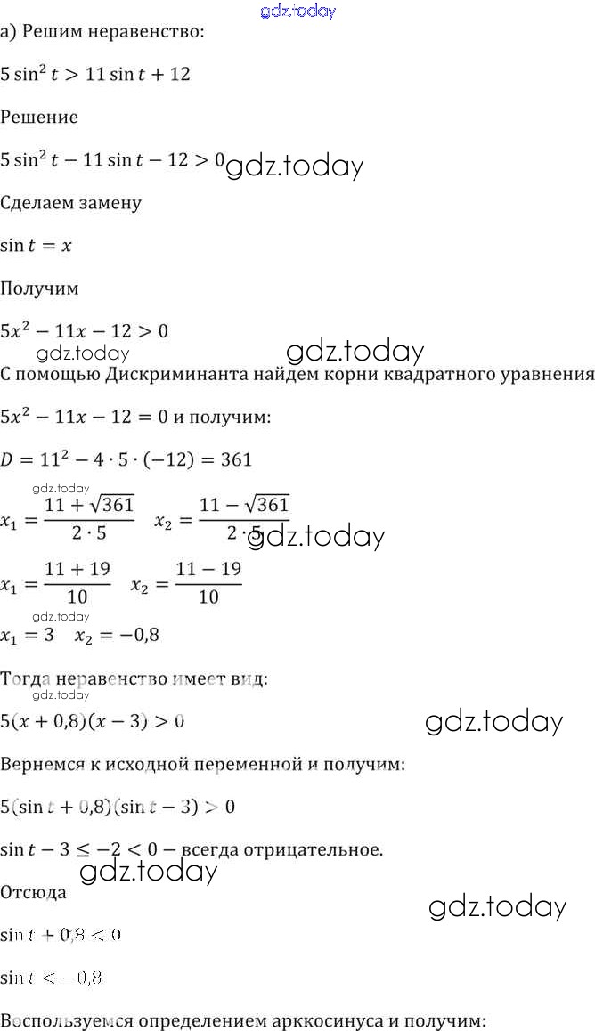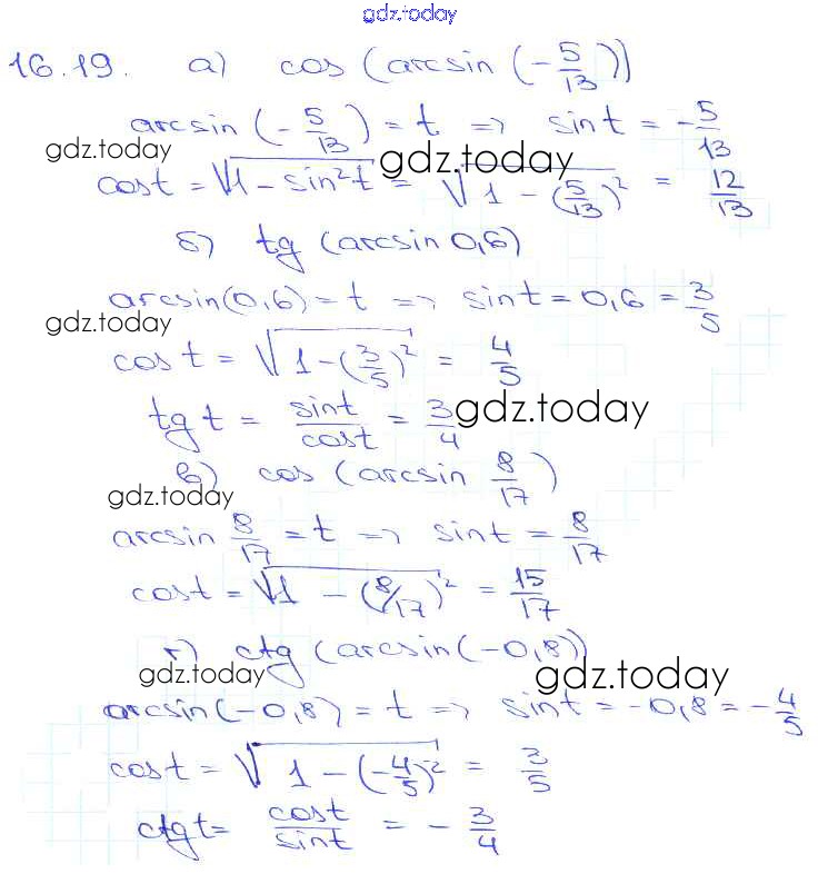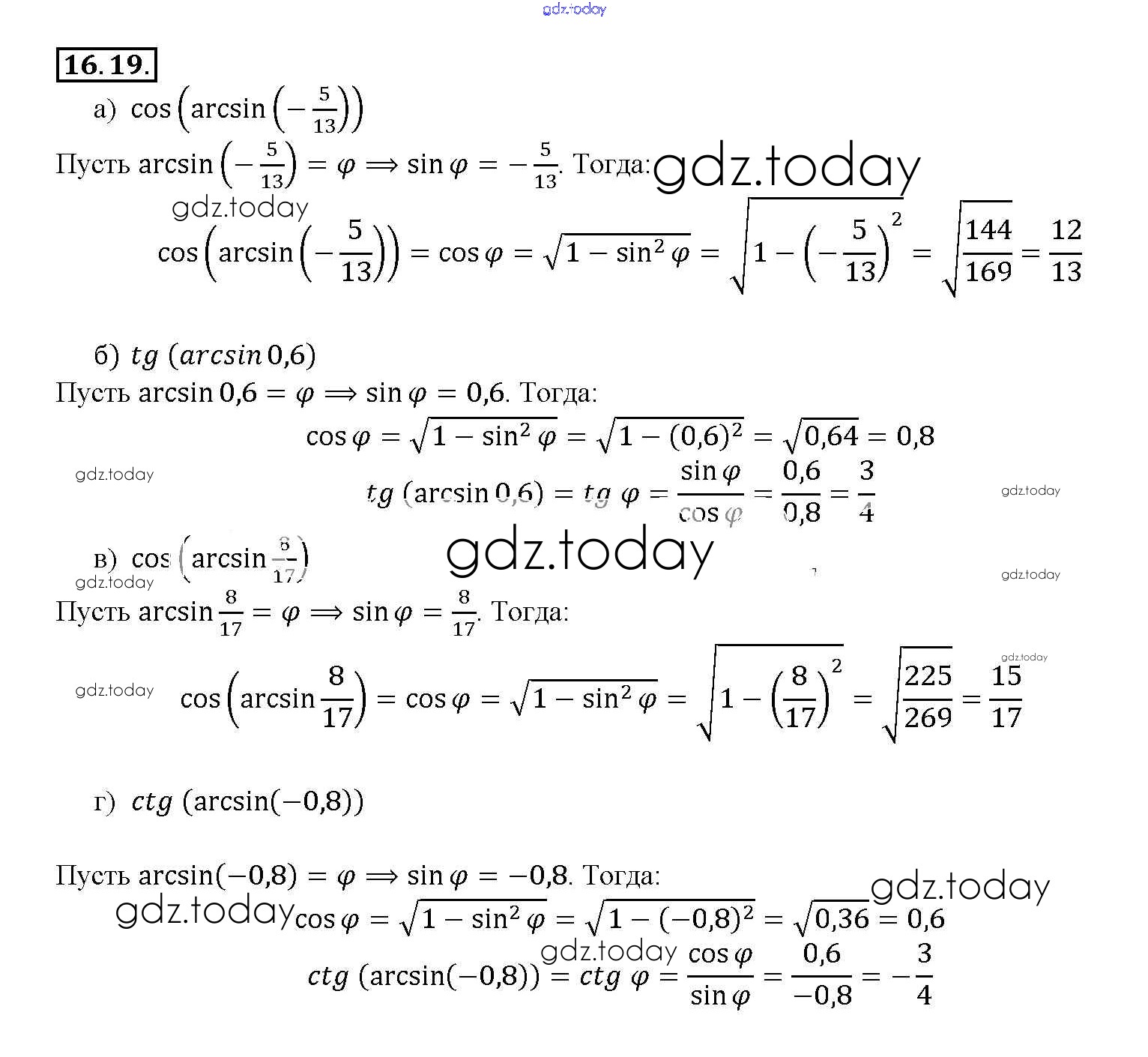 Ответы к §16. Арксинус. Решение уравнения sin t = a Глава 3 16. 19 Задачнику по Алгебре для 10-11 класса Мордкович, Денищева Базовый уровень Мнемозина 2015