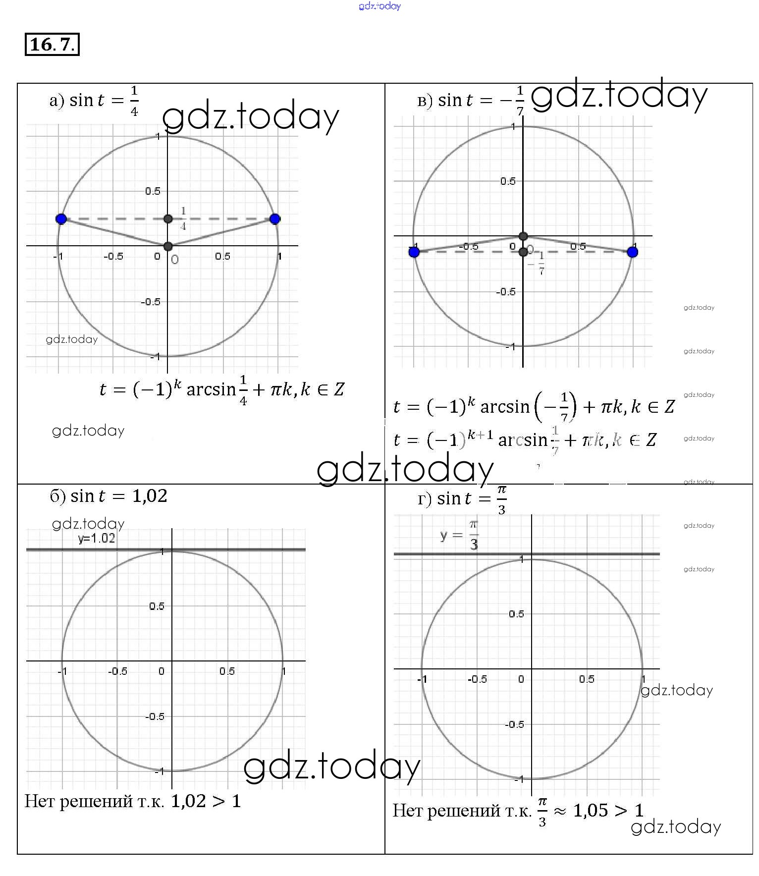 На страницах сайта gdz.today вы найдете учебный и вспомогательный материал, направленный на улучшения знаний школьной программы. ГДЗ - онлайн мир знаний §16. Арксинус. Решение уравнения sin t = a Глава 3 16. 7 Задачнику по Алгебре для 10-11 класса Мордкович, Денищева Базовый уровень Мнемозина 2015