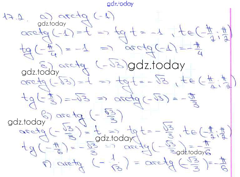 Ответы к §17. Арктангенс и арккотангенс Глава 3 17. 2 Задачнику по Алгебре для 10-11 класса Мордкович, Денищева Базовый уровень Мнемозина 2015