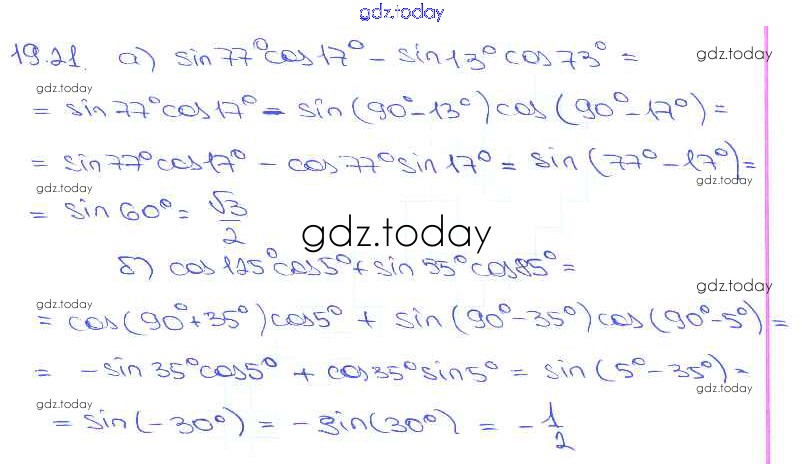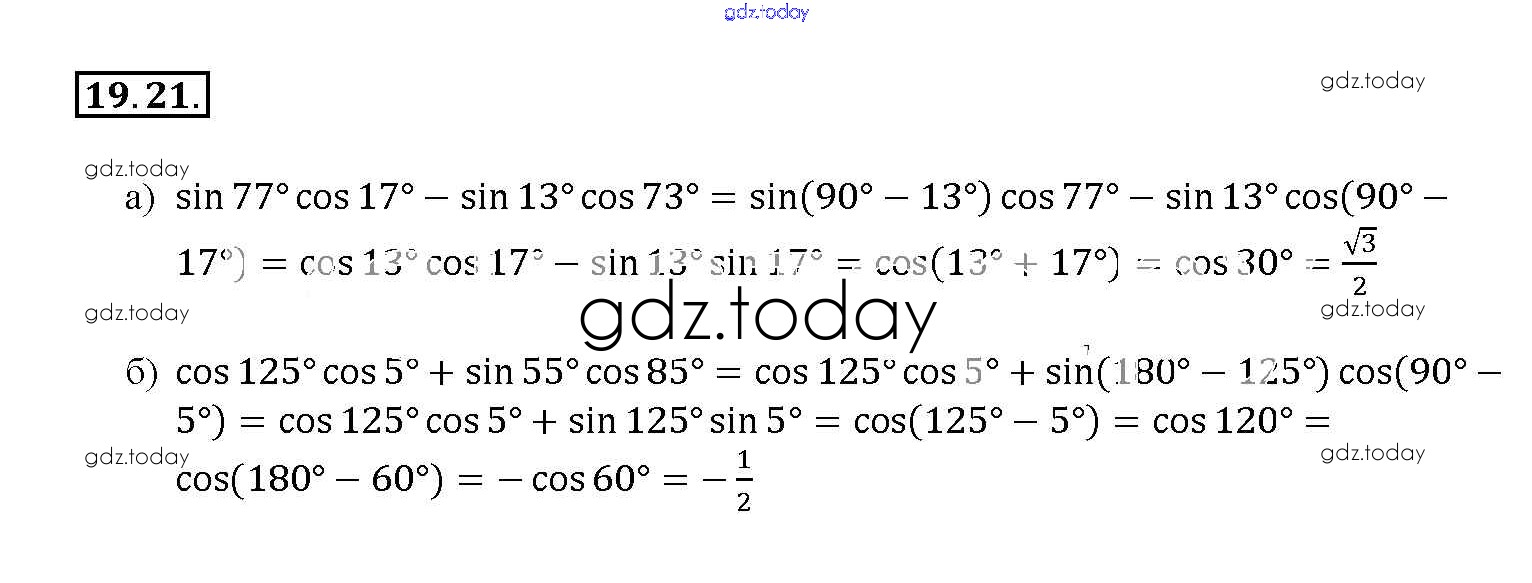 Ответы к §19. Синус и косинус суммы и разности аргументов Глава 4 19. 21 Задачнику по Алгебре для 10-11 класса Мордкович, Денищева Базовый уровень Мнемозина 2015