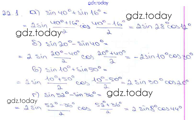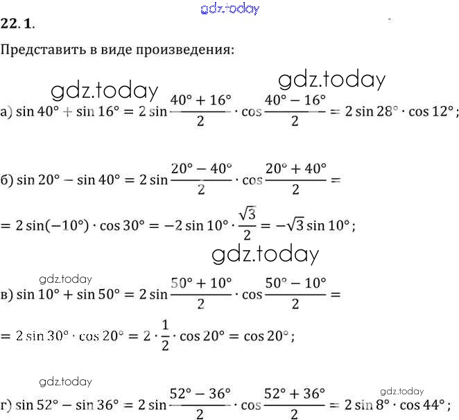 Ответы к §22. Преобразование суммы тригонометрических функций в произведения Глава 4 22. 1 Задачнику по Алгебре для 10-11 класса Мордкович, Денищева Базовый уровень Мнемозина 2015
